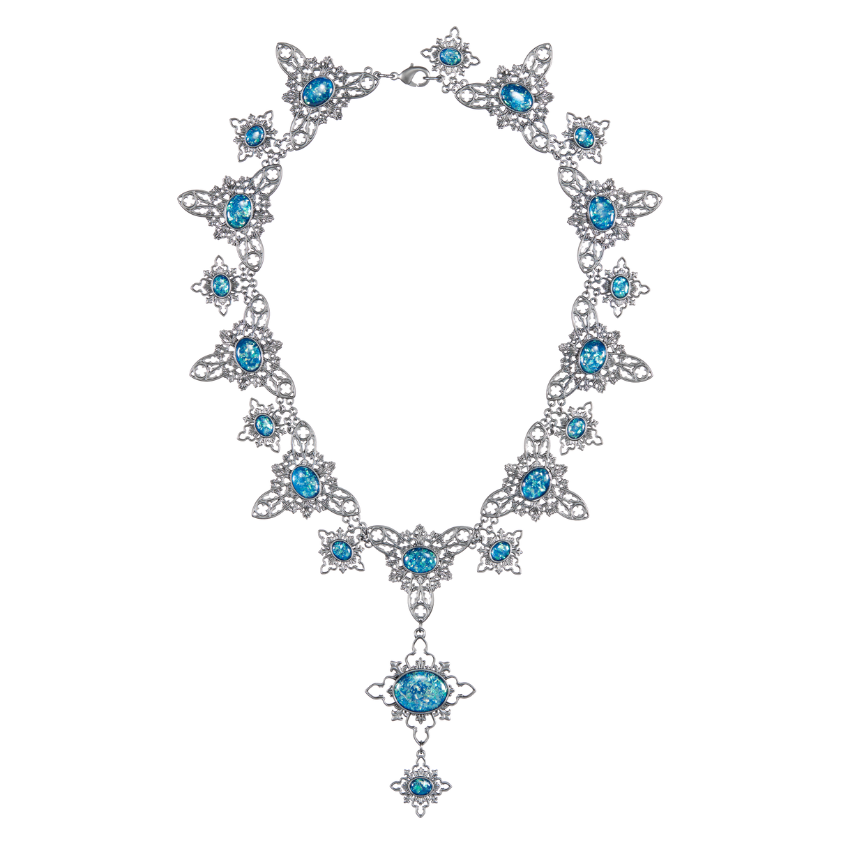Complete with 20 iridescent blue stones and intricate aged silver metal embellishments, keep it safe or show it off with its 13″ tall leatherette collector’s display box, featuring metal swing clasps and lined with plush black velour fabric.