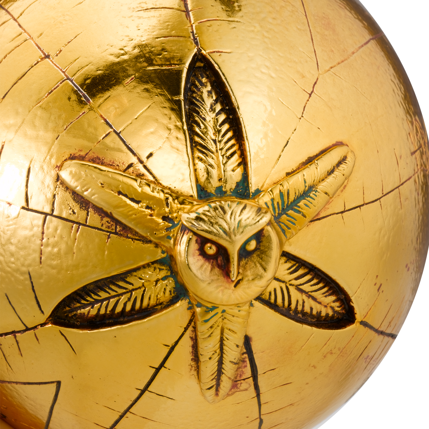 A shining replica of Harry’s Golden Egg, won during the First Task of the Triwizard Tournament in Harry Potter and the Goblet of Fire (2005). Crafted in resin, the egg is hand-painted and comes with a stand for display.