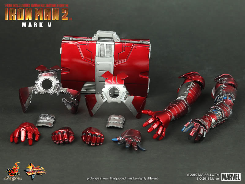 The Mark 5 features metallic red and silver coloring and accordion-like armor. When attacked by his nemesis Whiplash on the Monaco street circuit, its outstanding portability and incredible power save Stark's life.